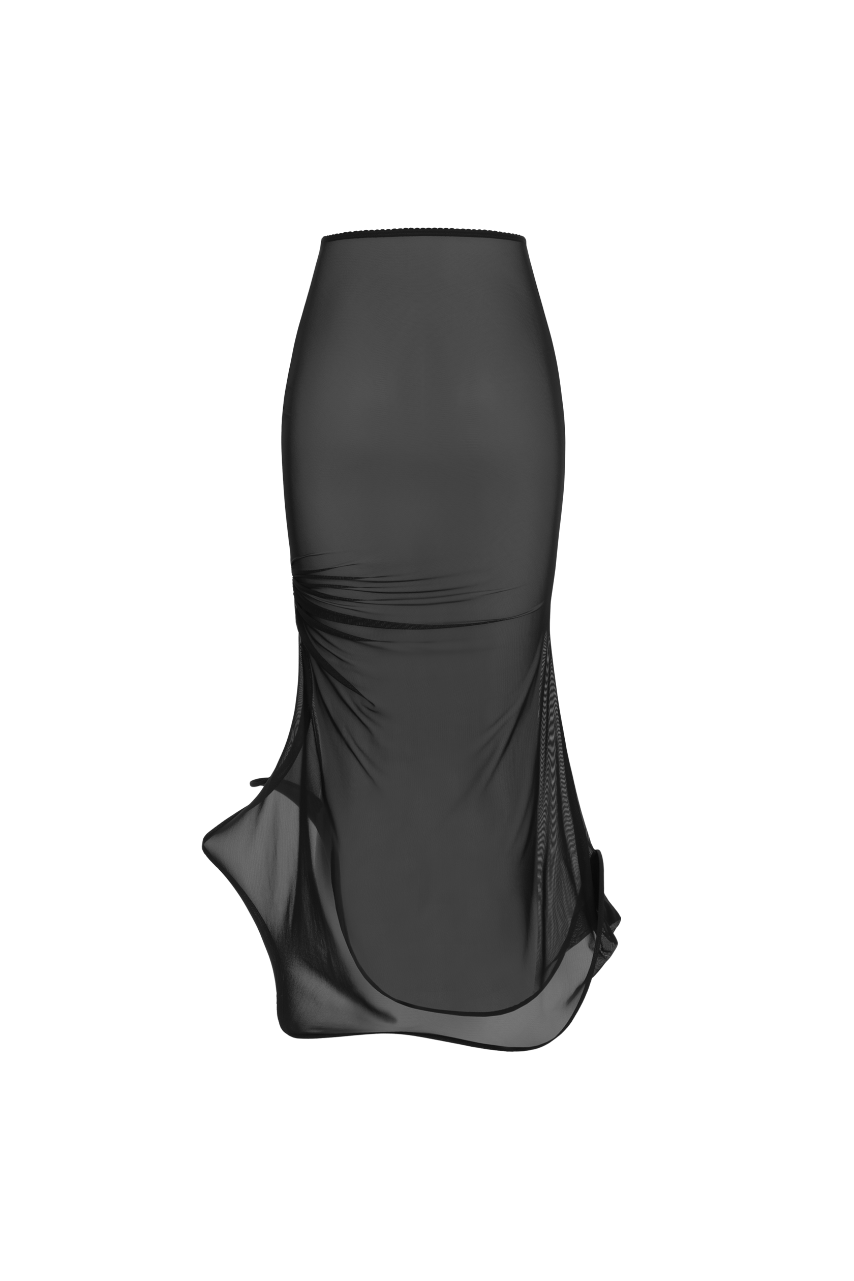 A maxi skirt made of transparent mesh with a high slit, finished with a rigid trim along the hem, moves smoothly with every movement, creating a sense of fluidity and elegance.