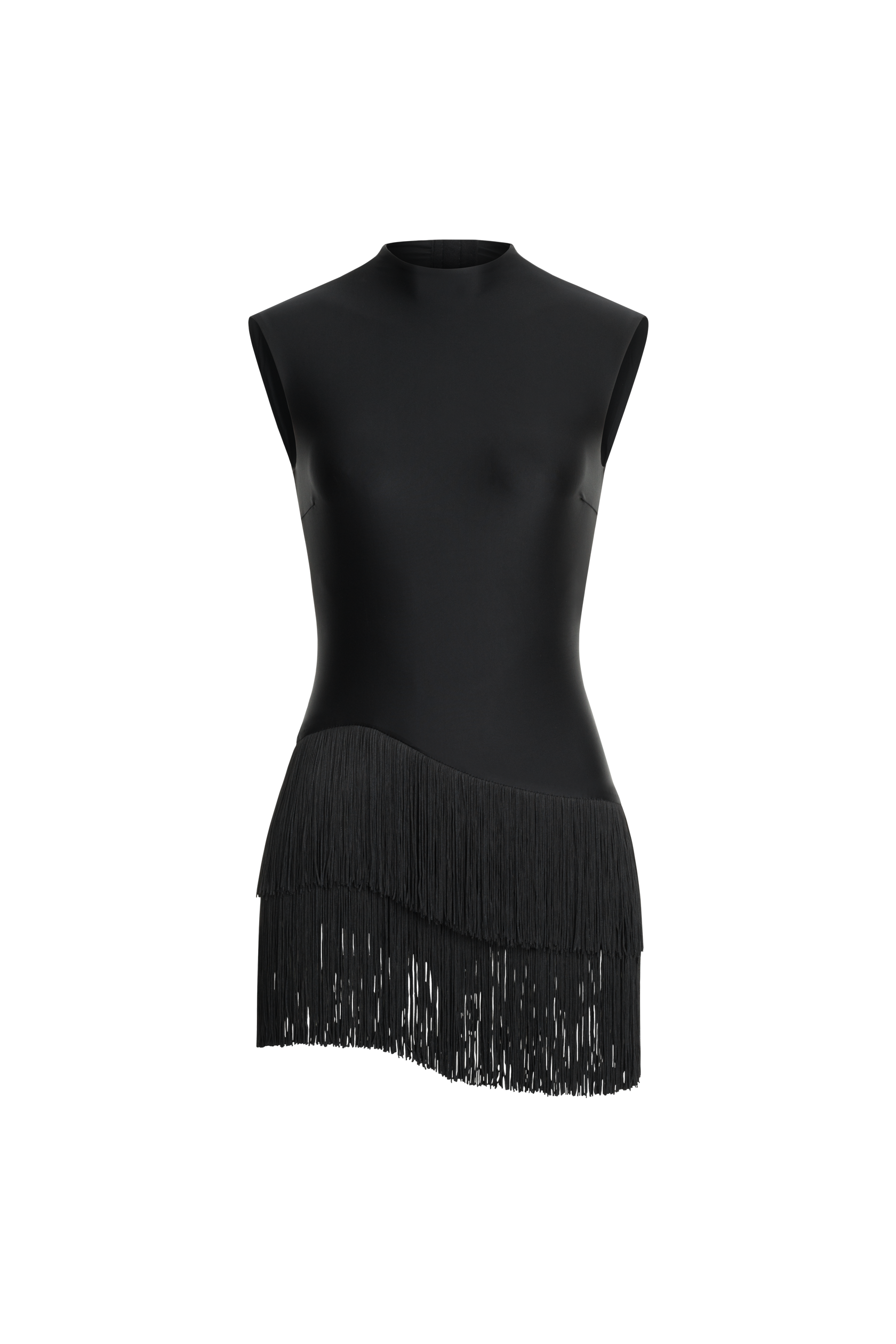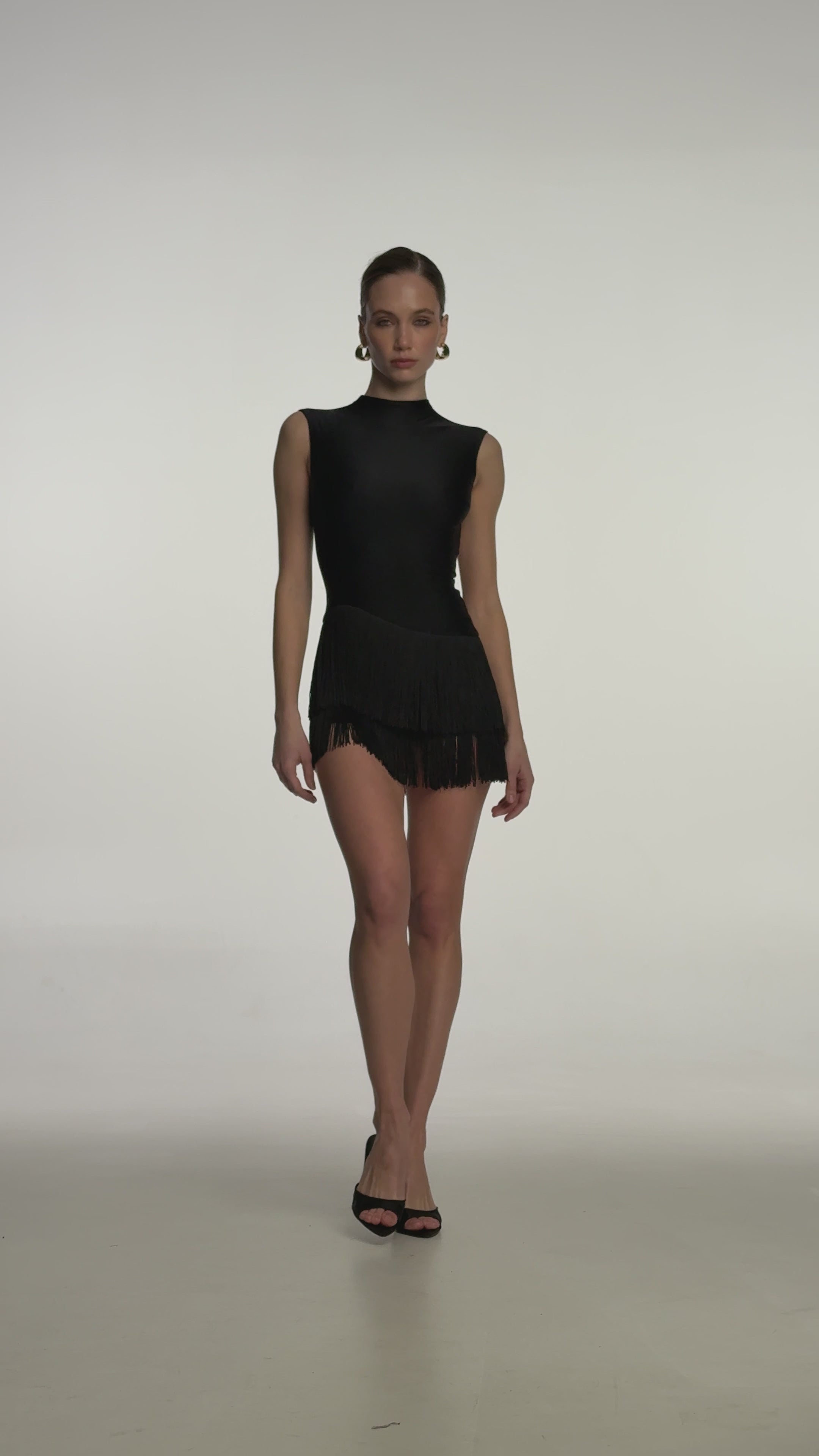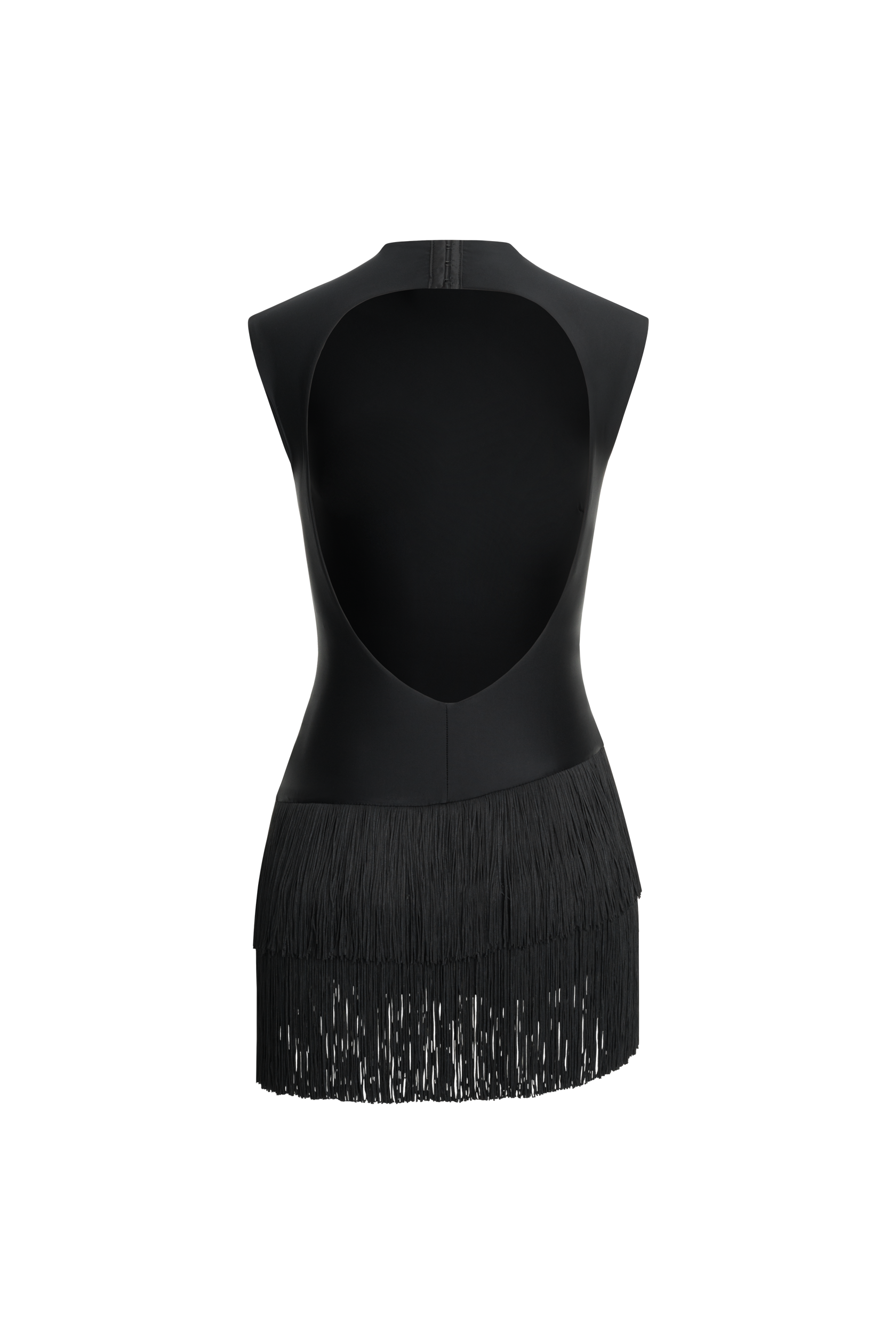 The RENDEZ-VOUS dress, made of high-quality Lycra, has a fitted top. A distinctive feature of the dress is the bottom—a skirt-shorts with fringe, which creates smooth movements and a spectacular silhouette. The open back adds an interesting detail to the look.