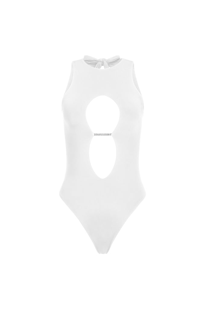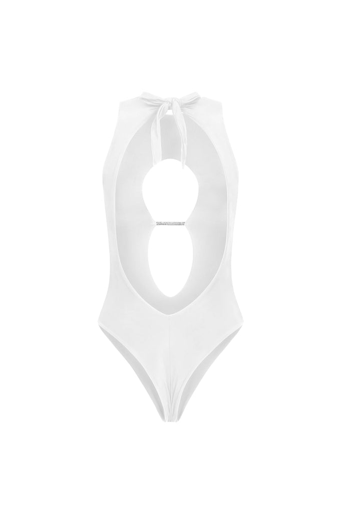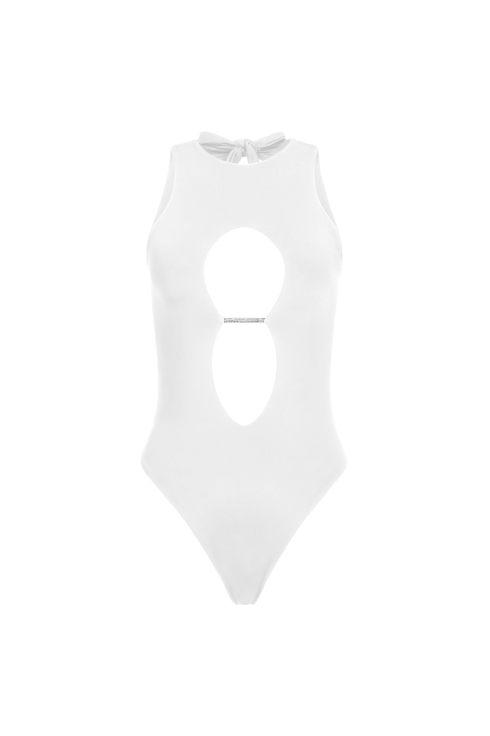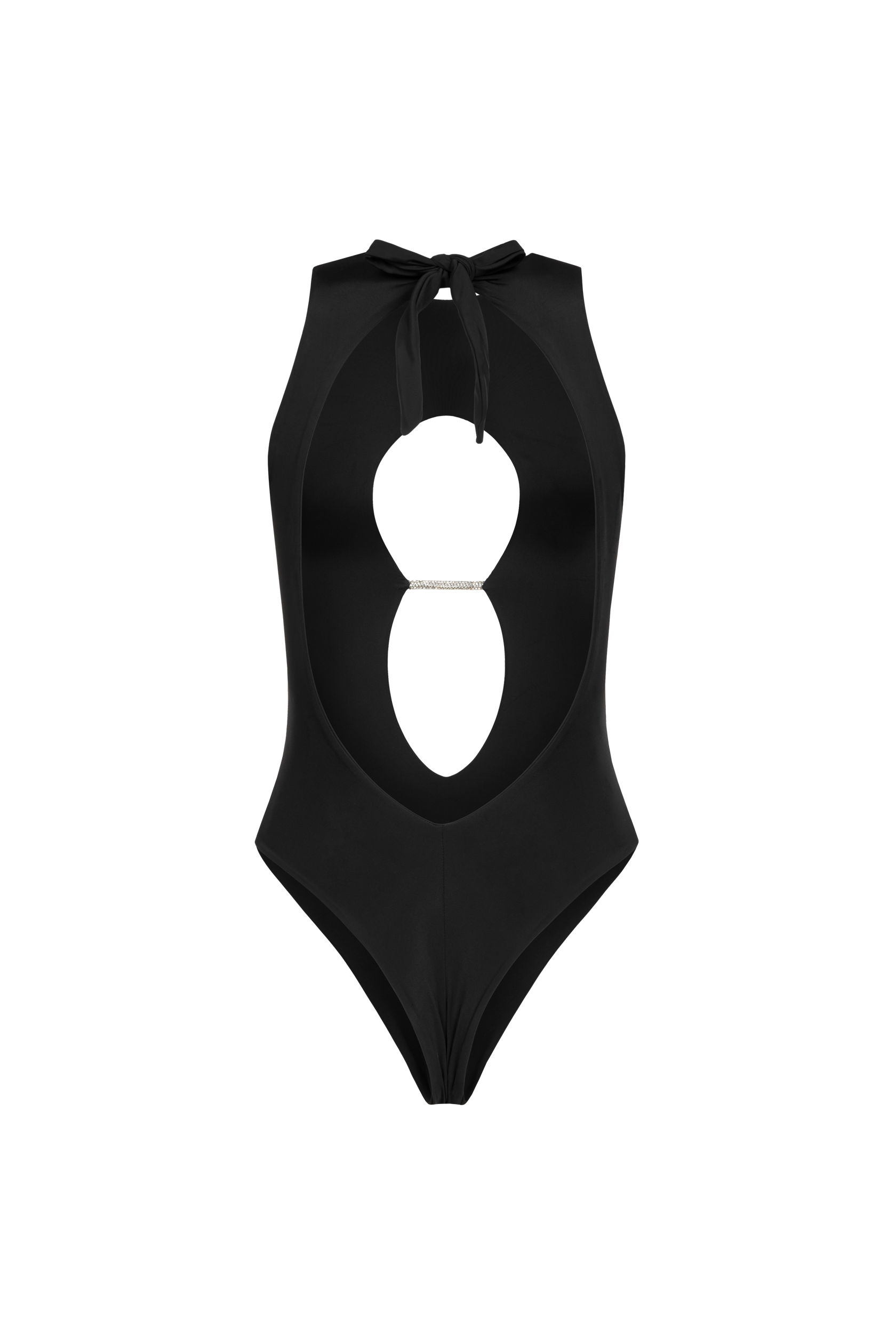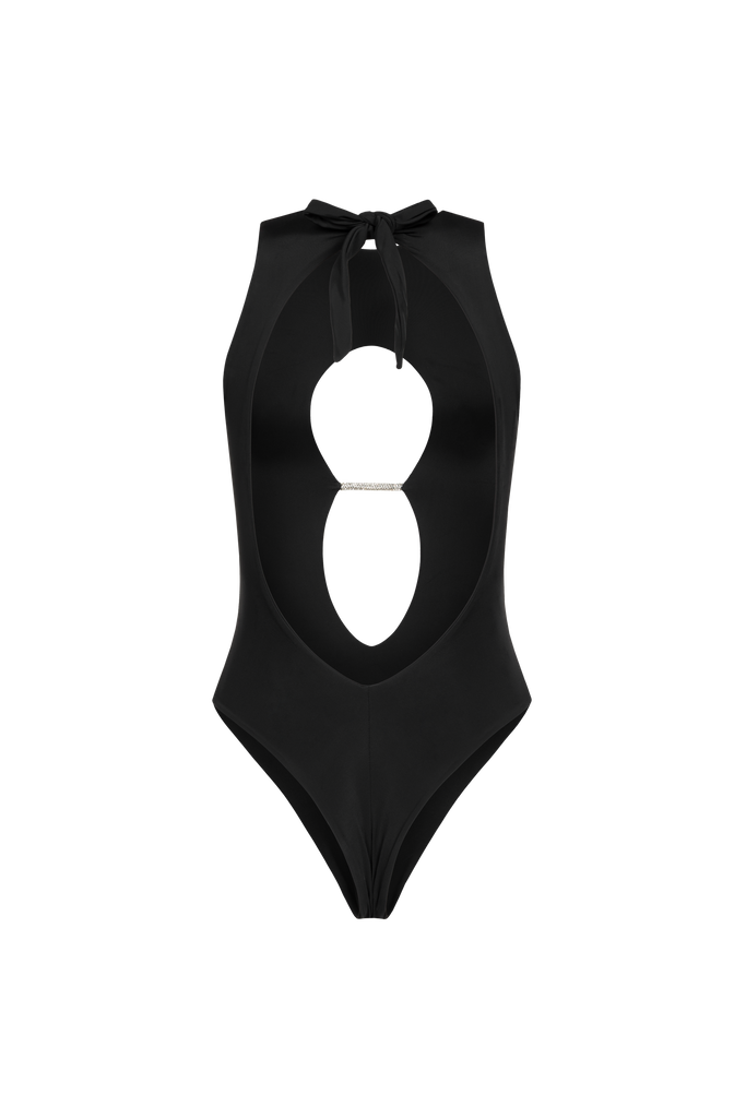 Thanks to the design, it beautifully gathers the chest and makes it visually larger. The swimsuit is tied on the back. The front has a suede crystal lace insert that adds sophistication and gloss.