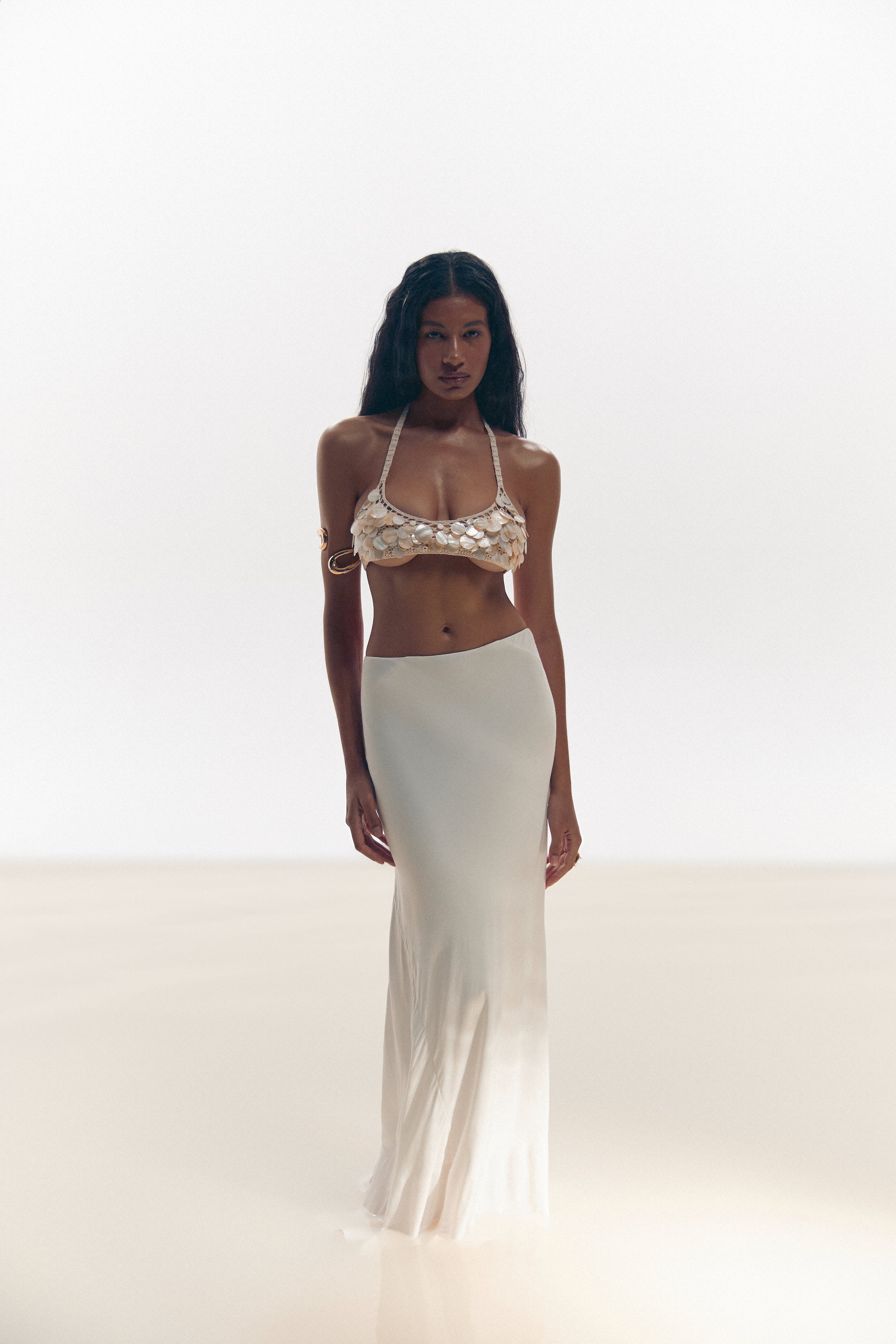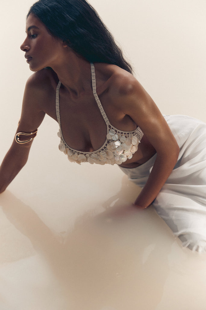 This wicker top is hand-embroidered with shell beads. Looking at it, you can feel the warm rays of the sun and the sand on your skin. It immediately makes you want to go to the ocean and enjoy the sound of the waves.