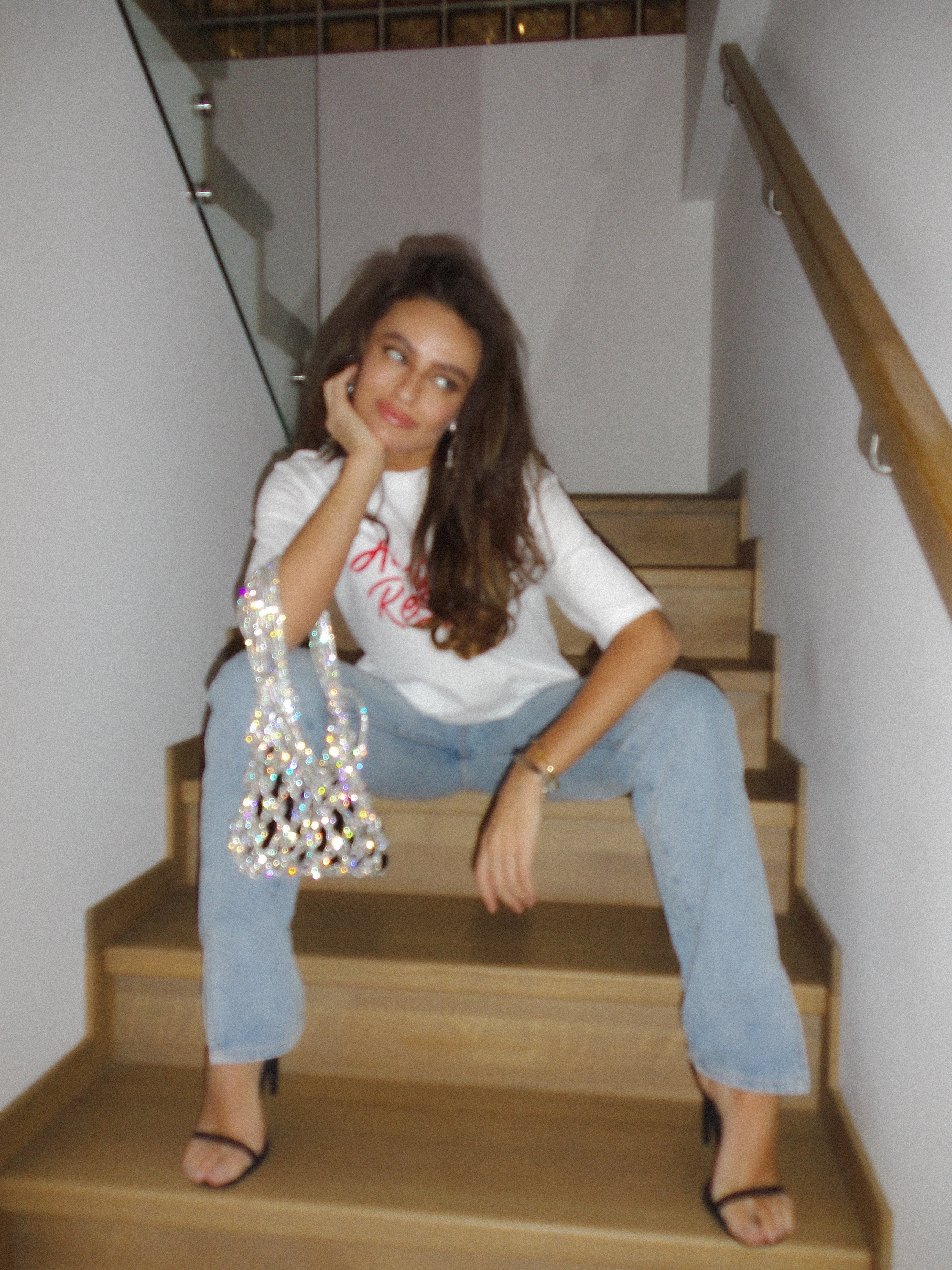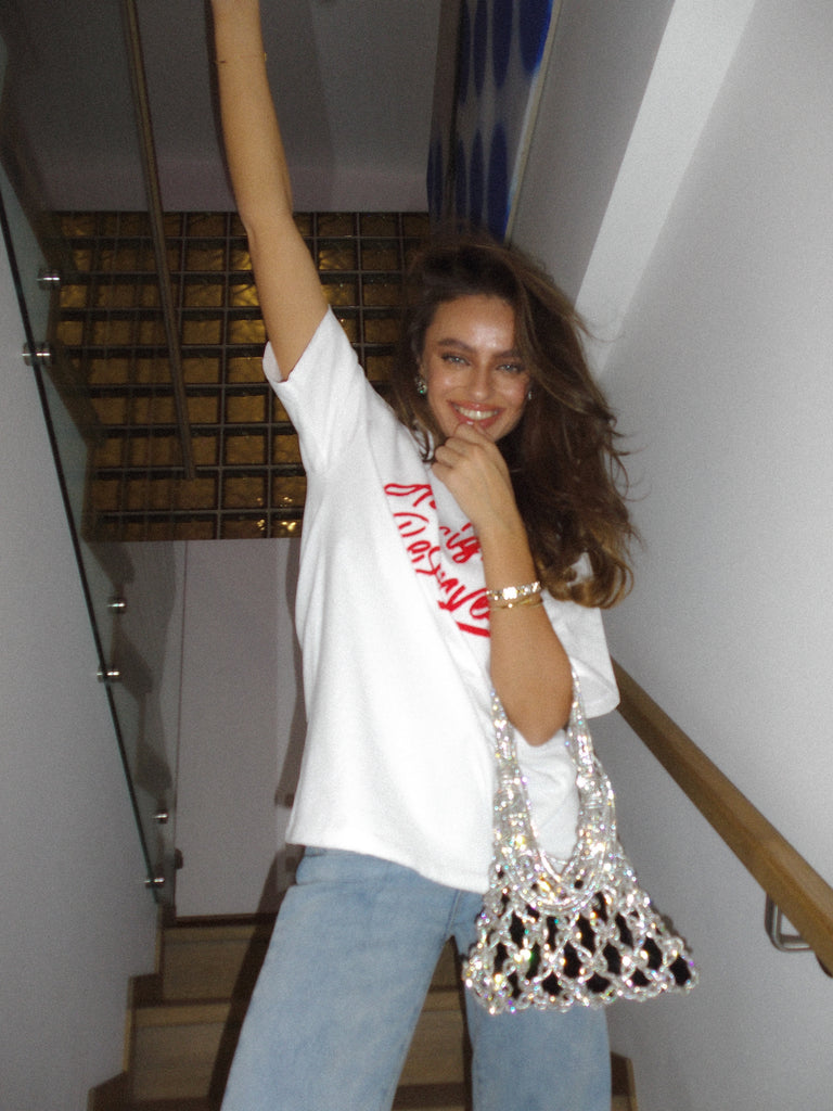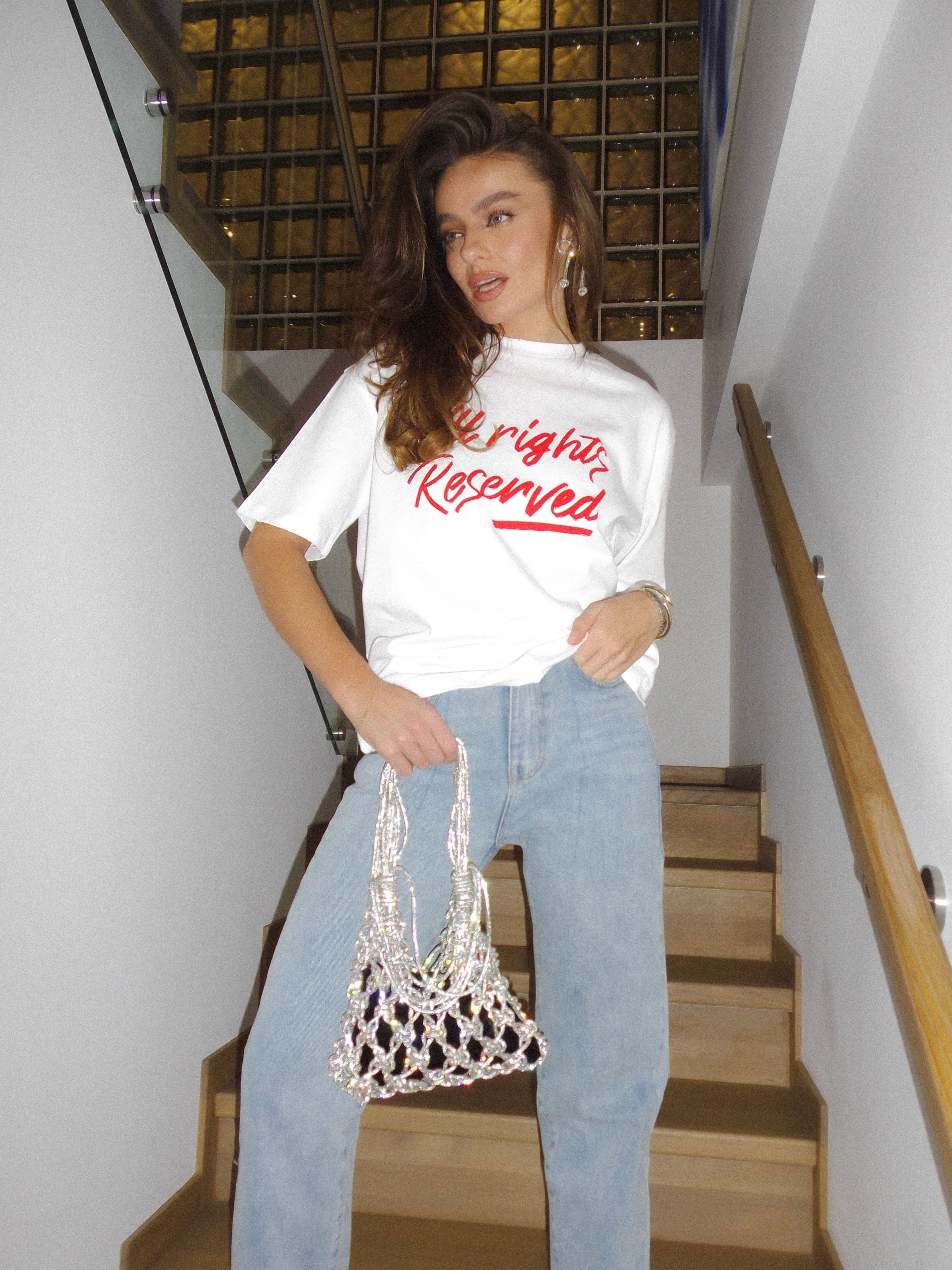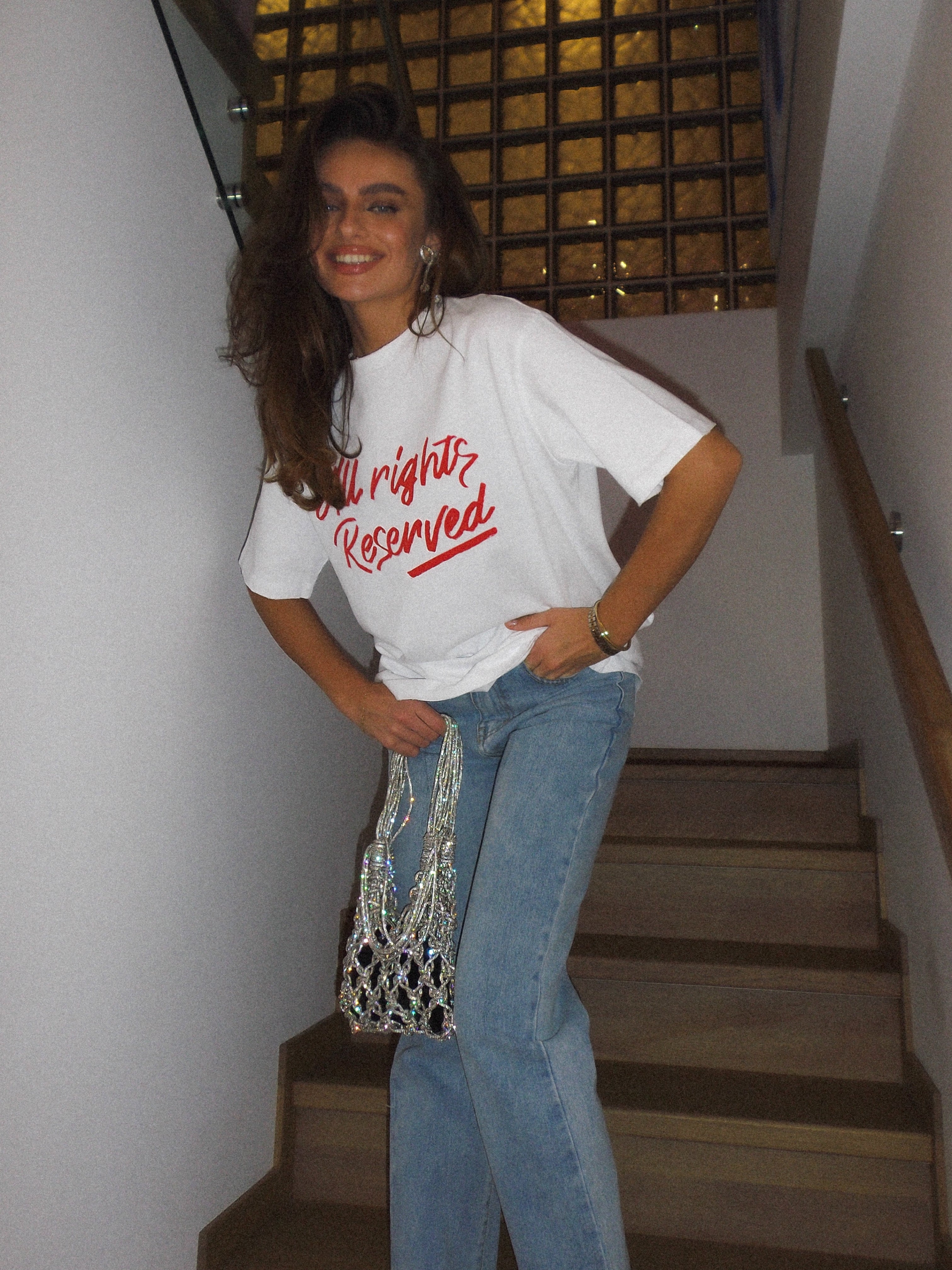 White T-shirt with a round neckline and a dropped shoulder line. The model is made of cotton jersey knitwear. The cut is oversized. The font is stylized as an inscription in red lipstick.