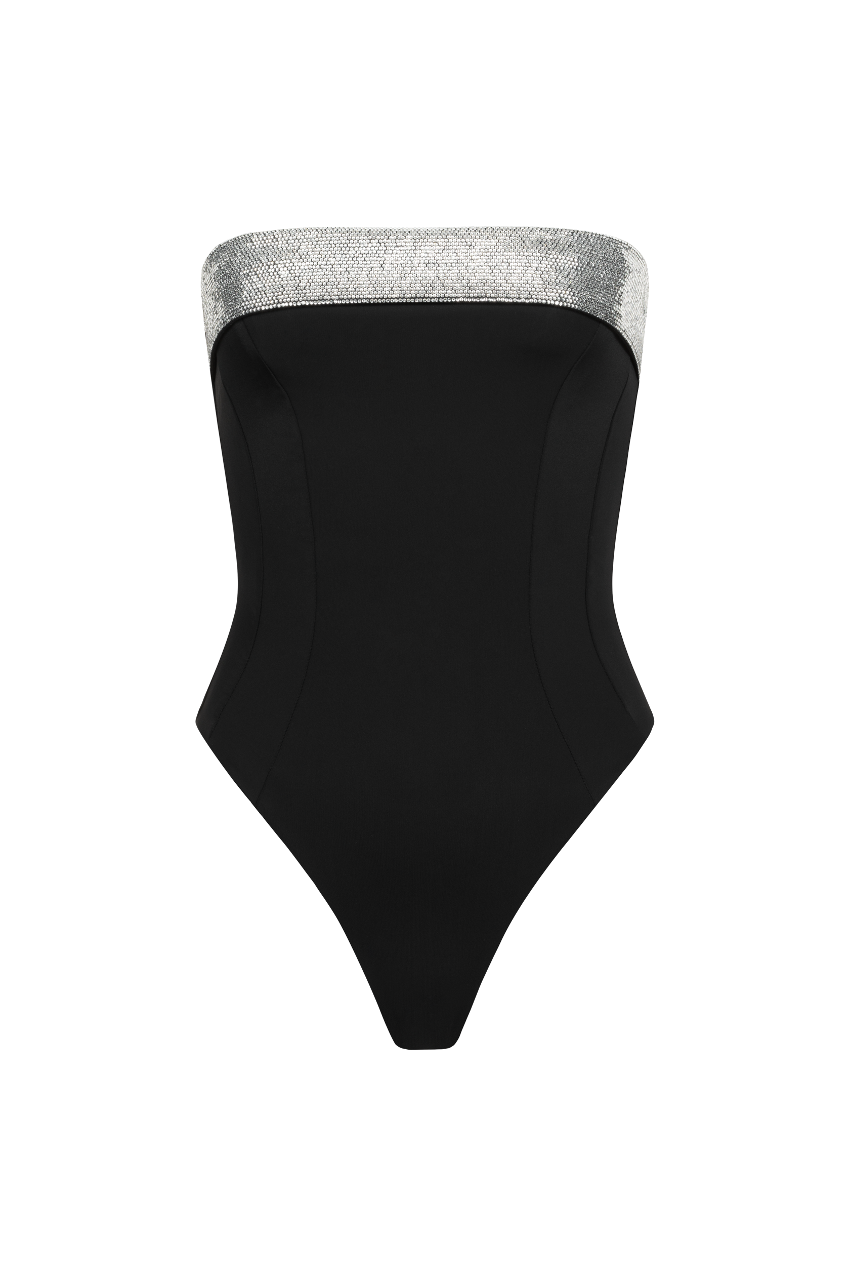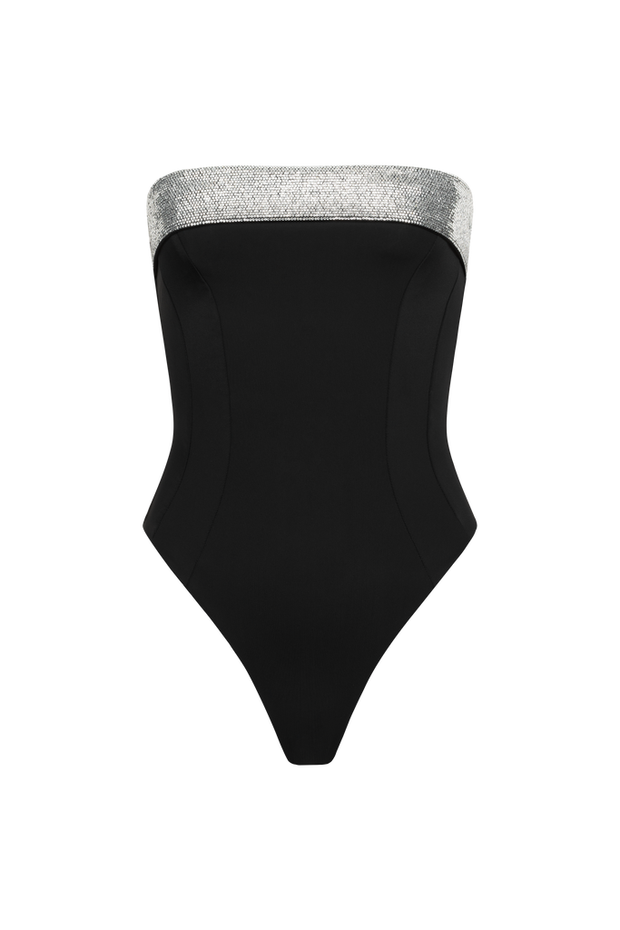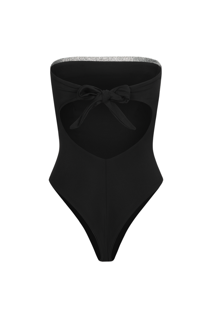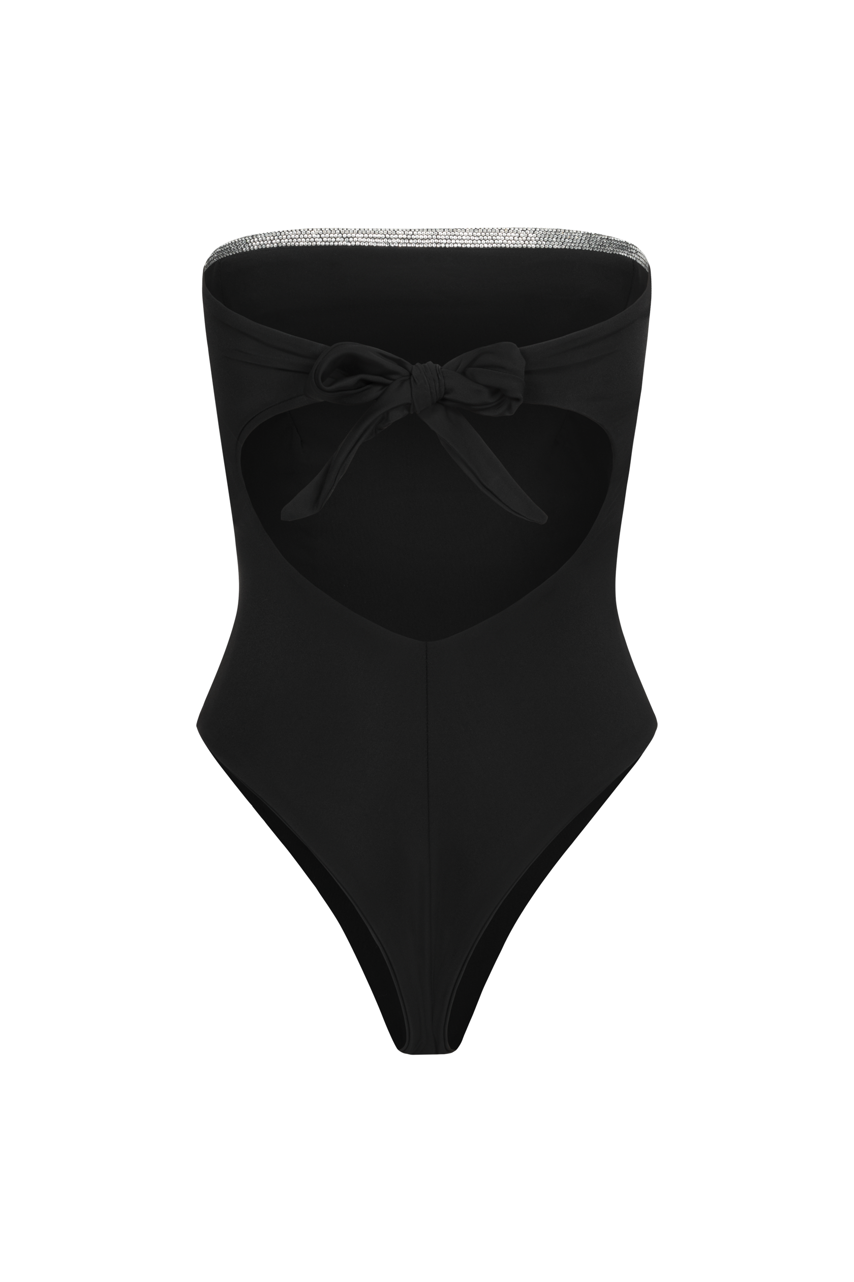 Model ozdobiony błyszczącą aplikacją na biuście i wiązaniem na plecach, które zapewnia idealne dopasowanie.