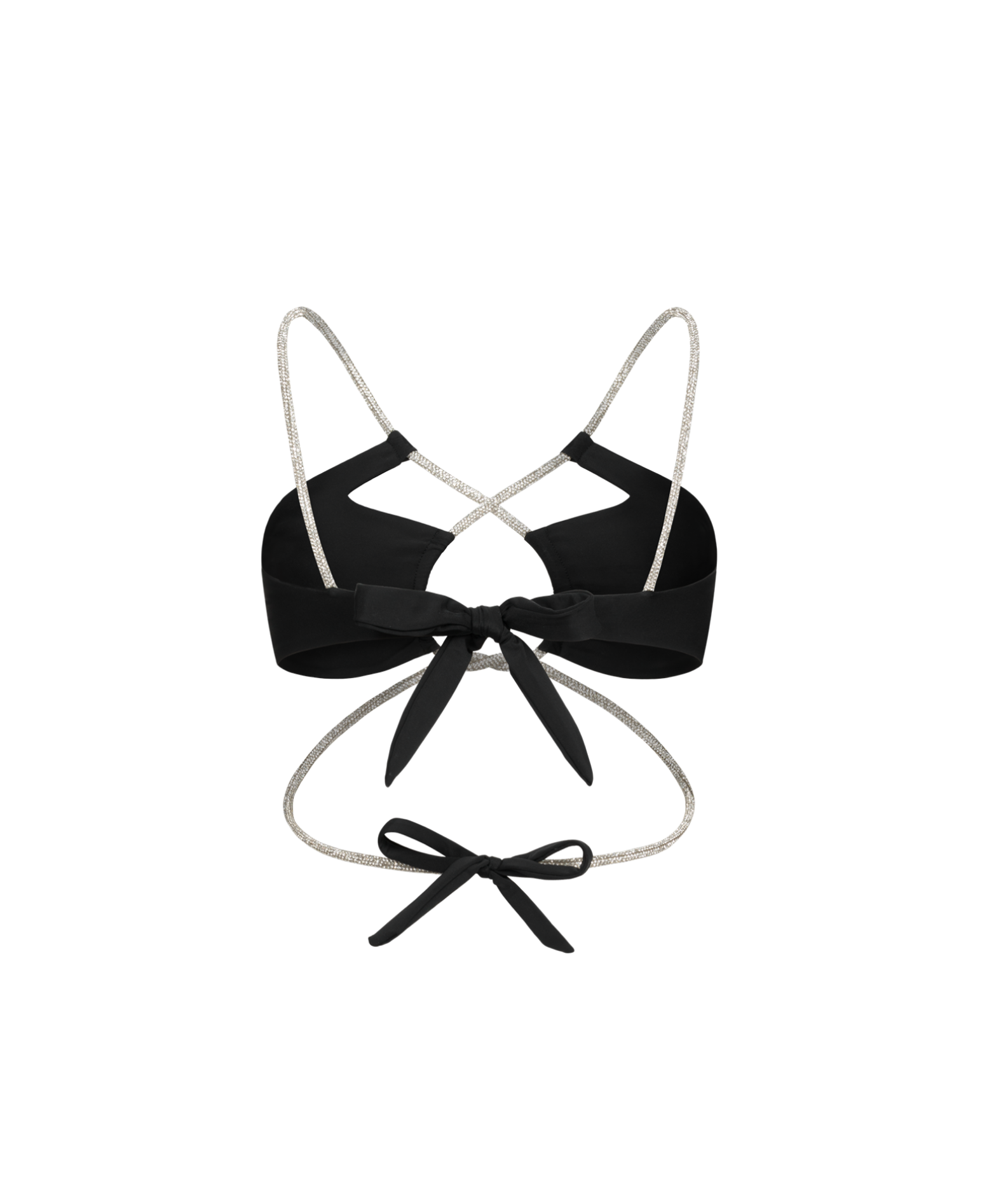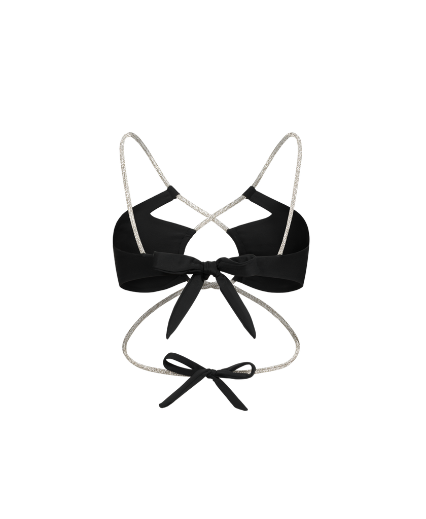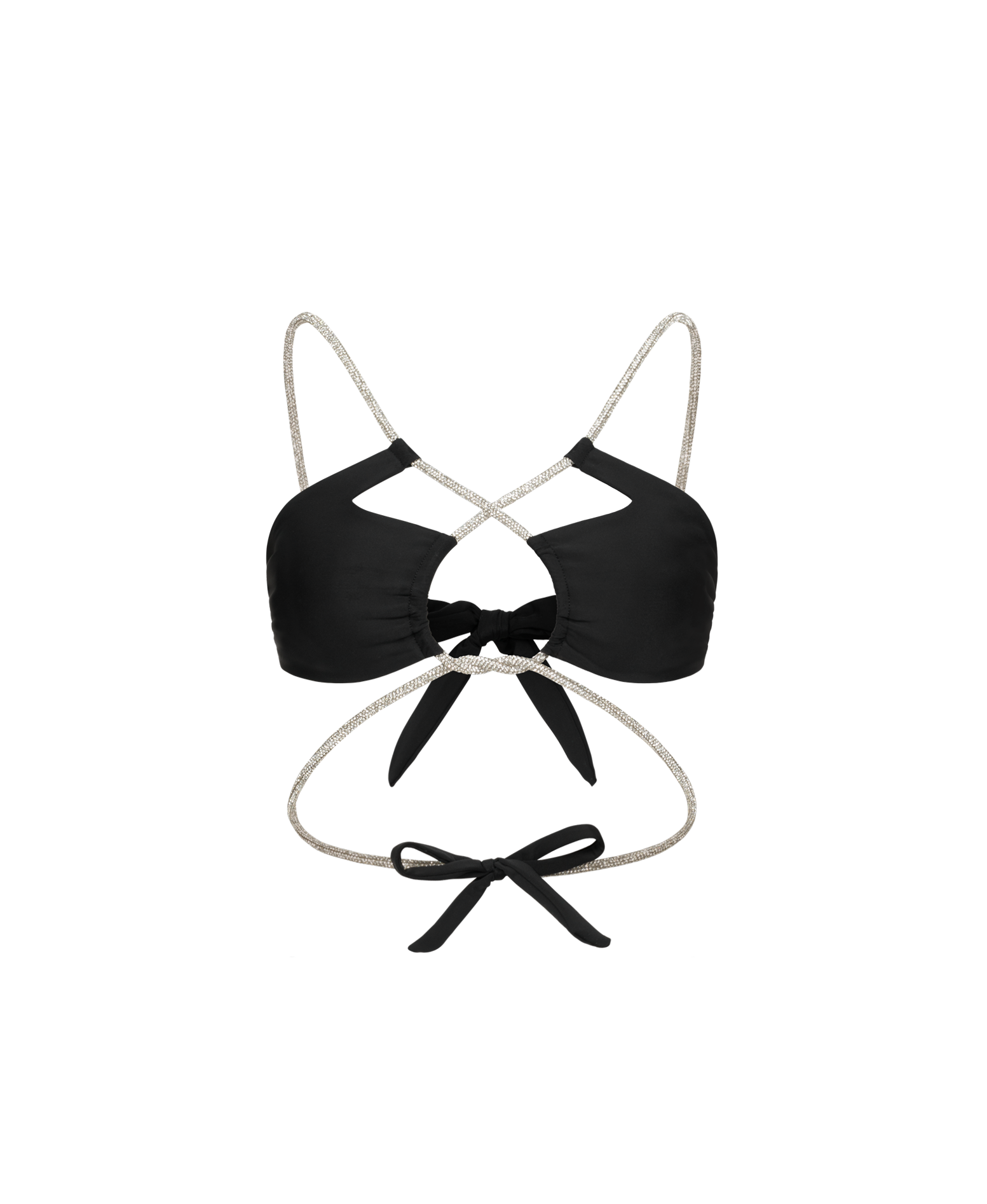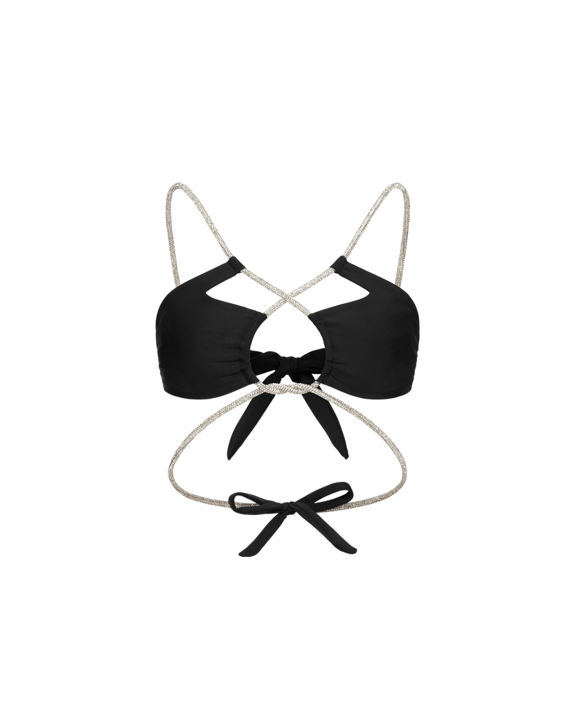 Czarny top kąpielowy POSITANO z luksusową, kryształową koronką pięknie mieni się w słońcu i przyciąga wszystkie spojrzenia. Wybierz go na swoje niezapomniane podróże i ciesz się rolą tej, na którą patrzą wszyscy.
