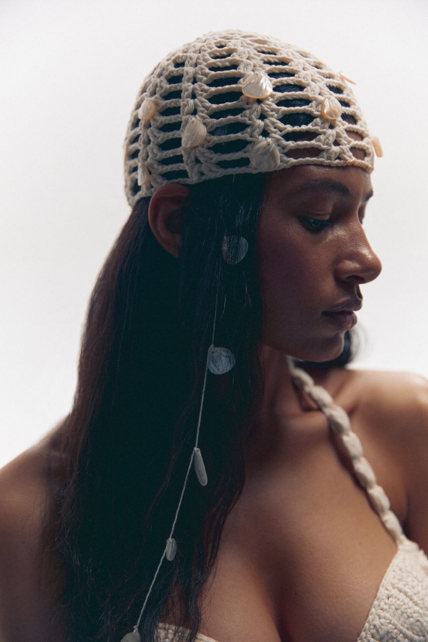 This delicate knitted hat is completely handmade and embroidered with shell beads, in a beautiful muted light wheat color. It is perfect for being spectacular in the sun, whether on the beach, during a walk, or a stylish party.